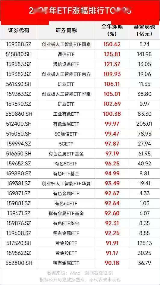 2025年场内ETF成绩,绝对要比基金的表现更为耀眼,其中有6只ETF涨幅超100%。而且通信ETF大涨125.81%夺冠,矿业ETF、创业板人工智能ETF华宝、有色矿业ETF招商和工业有色ETF等涨幅也超过100%。